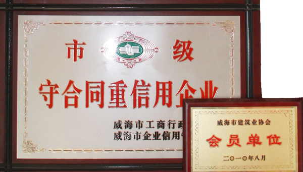 公司連續八年榮獲威海市“誠信開發企業”、“建筑施工誠信企業”,連續九年被評為威海市級“守合同重信用企業”,多次被評為威海市“市級文明單位”、“質量管理先進企業”、 “安全管理先進企業”,乳山市“優秀企業”、“先進民營企業”、“納稅明星企業”,在社會上逐步樹立了誠信、穩健的企業形象。